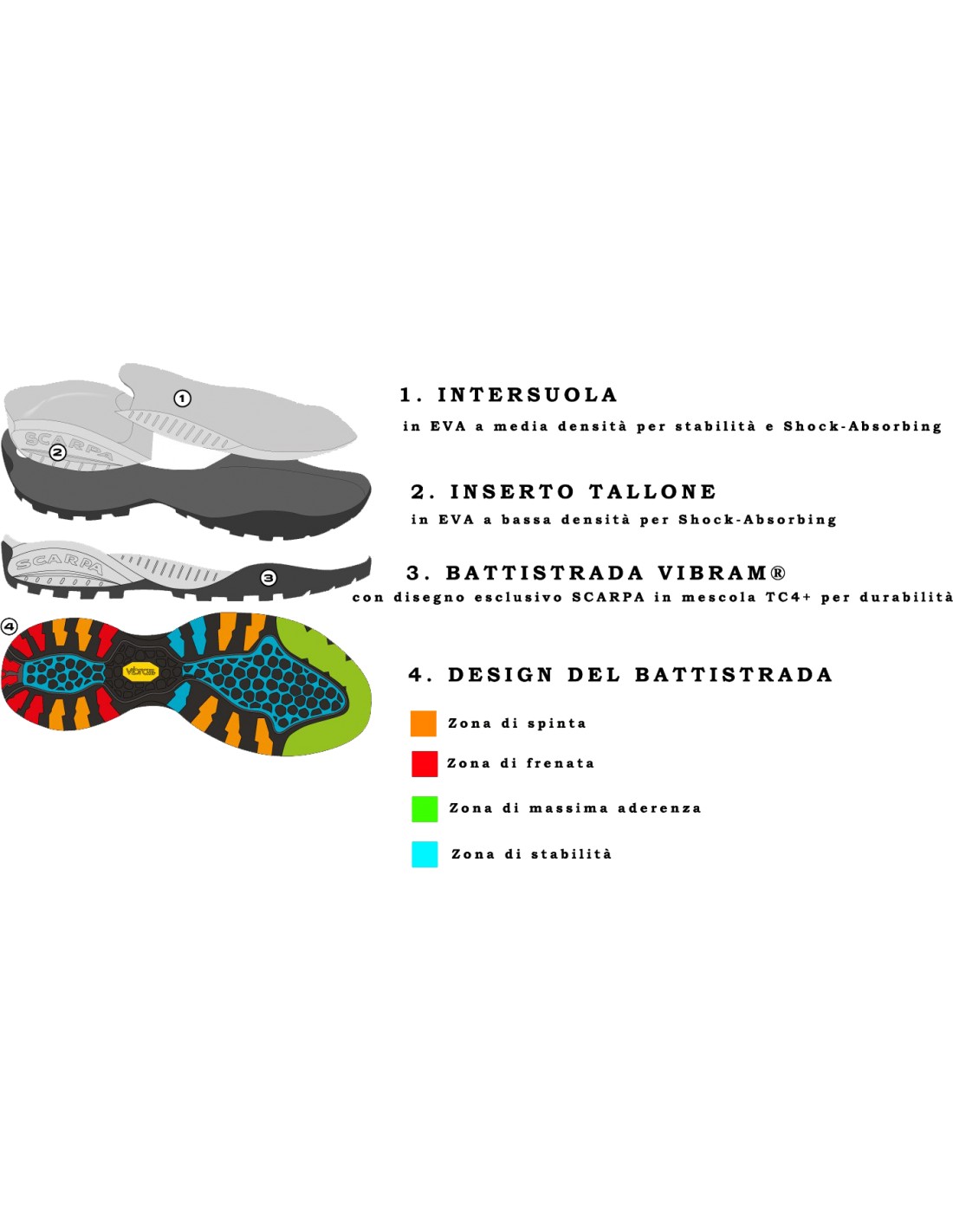 - Battistrada: con protezioni laterali in gomma vibram® con disegno esclusivo SCARPA in mescola TC4+ per durabilità
