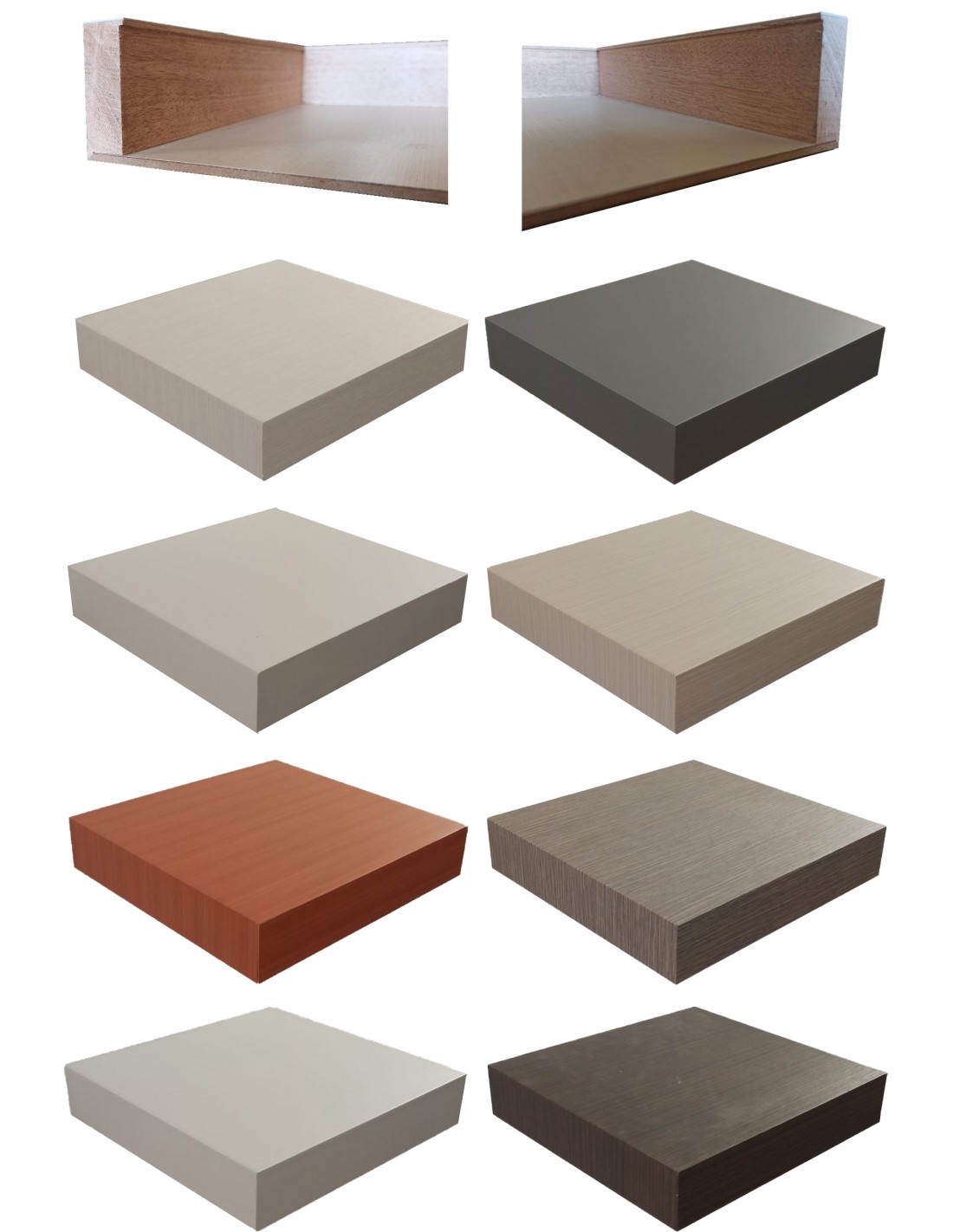 - Bianco, ciliegio, grigio chiaro, grigio scuro, Legno grigio chiaro, legno grigio fumo, Legno naturale, legno venato bianco, Wenge