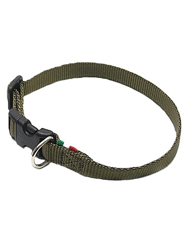Collare in nylon verde regolabile con fibbia in plastica nera. Lunghezza massima del collare 53 cm e larghezza 2 cm. Prodotto in Italia.