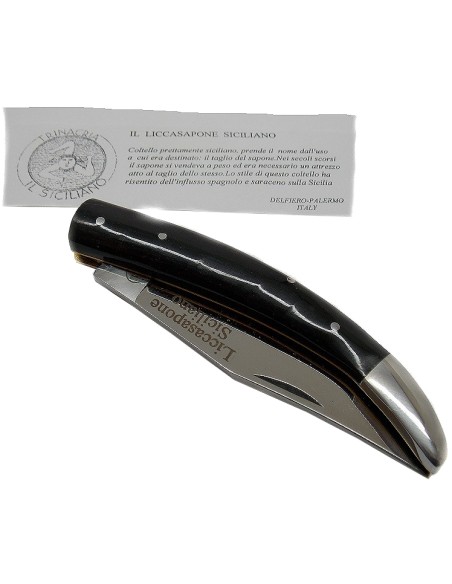 Il coltello siciliano Liccasapone è un tradizionale coltello da tasca originario della Sicilia. Questo particolare modello presenta una lama con una lunghezza di 7 cm e un manico realizzato in corno.