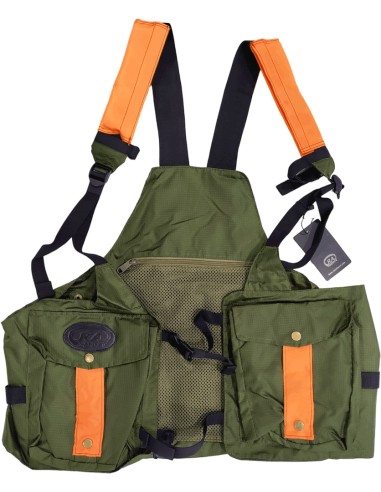 Gilet trisacca in polyester verde e arancione con 2 tasche davanti con all'interno una tasca e due cartuccere elastiche. Un tascone dietro. Gilet regolabile lateralmente e frontalmente. Inserti ad alta visibilità rimovibili. Misura unica.