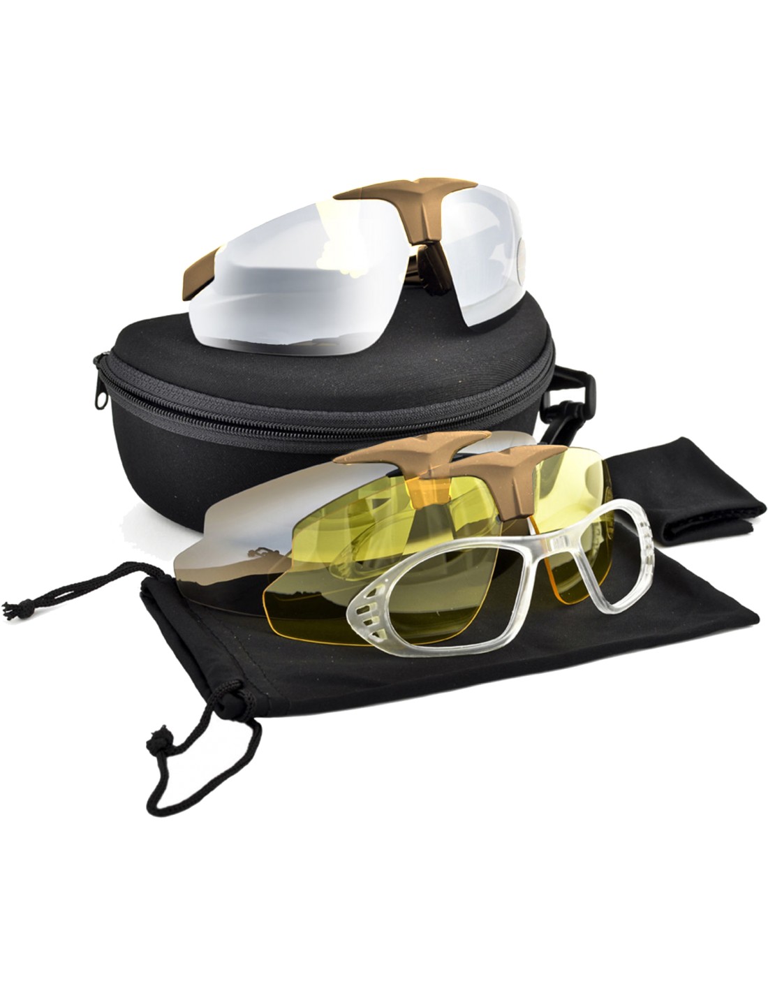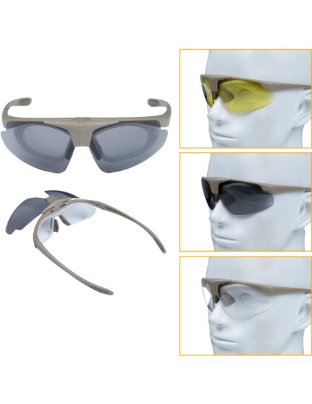 Kit occhiali protettivi composto da tre lenti in policarbonato UV 400 100% protection e montatura predisposta per lenti da vista.
