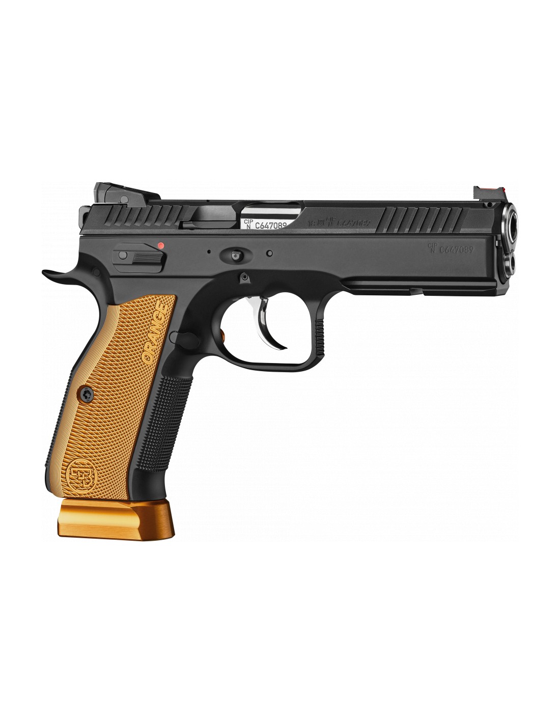 La parola "Orange" nelle pistole sportive di CZ è sinonimo di massima qualità e prestazioni assolute. La base è la CZ SHADOW 2 che attualmente occupa il podio nella Divisione Production nei più prestigiosi eventi internazionali di tiro dimanico. Il modello ORANGE, distinguibile a prima vista dal nuovo design delle guancette in alluminio nel tipico colore arancione, è stato portato alla perfezione da provate e collaudate modifiche. Le parti principali sono accoppiate a mano, il meccanismo di scatto è stato migliorato per una corsa del grilletto perfettamente liscia e ha un reset ridotto. La canna è lucidata e per migliorare la già alta precisione, c'è anche una boccola tipo "bushnig" alla volata. Inoltre, la pistola è dotata di un cane IPSC e di uno sgancio caricatore maggiorato in alluminio regolabile. Il caricatore ha un pad in alluminio e la sicurezza sinistra maggiorata offre una presa migliore.